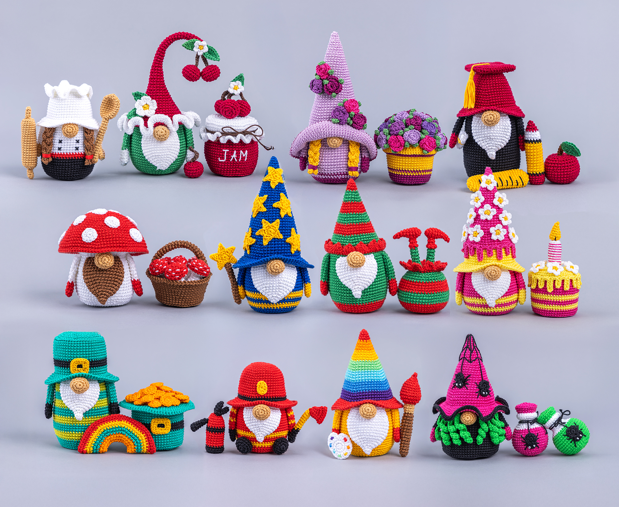 Make a baker gnome with his rolling pin, a birthday gnome with a frosted cake, a witch gnome with magical potions, a flowery garden gnome, a rainbow-colored artist gnome and many more!